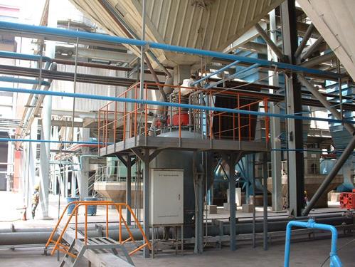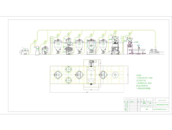 破碎机的物料通过1号气力输送机加料破碎机里进行处理,粉碎好的物料通过(2号、3号真空输送)加料到2号、3号料仓里,由分叉器分别将物料流入(2号关风机、3号关风机)关风机均匀把物料输送到(2号、3号振动筛),通过振动筛把好物料筛入小料仓里(2号缓冲料、3号缓冲料)再由(4号真空输送机)把物料输送到混合设备,当物料达到混合装载量时真空输送就停止,接着混合机开始运行到(混合机设定的时间),将混合好的物料放到下面缓冲料仓,首先打开启动蝶阀由(5号真空输送机)把物料输送到包装机(4号缓冲料)最后进行计量包装。